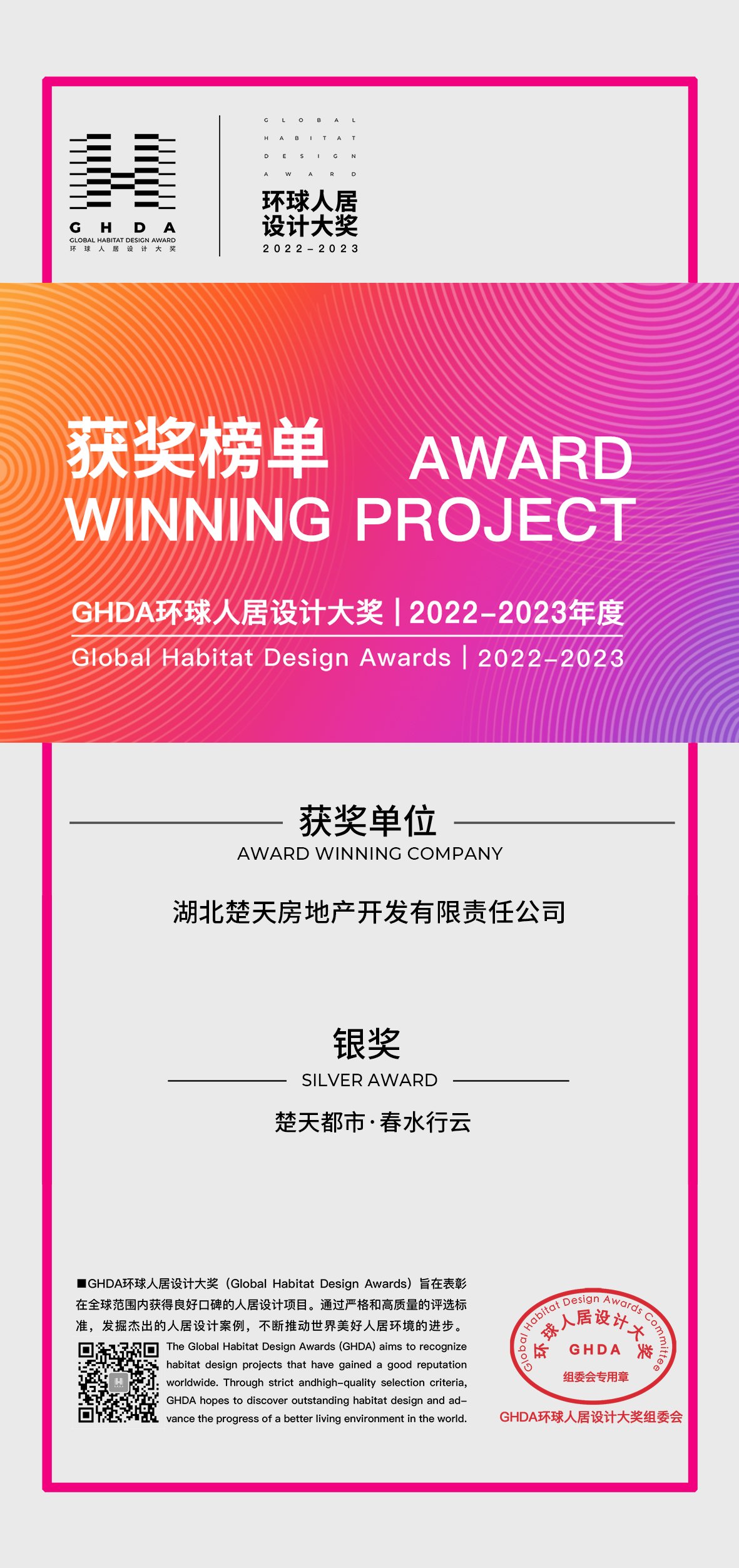 2023年7月  楚天都市·春水(shuǐ)行(xíng)雲榮獲2022-2023年度“GHDA環球人(rén)居設計(jì)大(dà)獎銀獎”